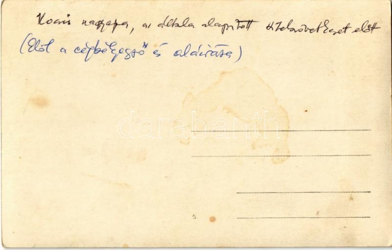 Sonkád, a Sonkád Vidéki Hitelszövetkezet és Gabonaraktár épülete az alapítóval Kocsis József lelkésszel, valamint a szövetkezet pecsétje és Kocsis aláírása, photo (fl)