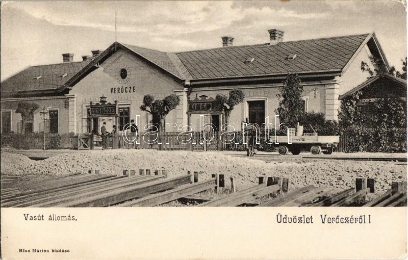 Beschreibung: Verőce, Nógrádverőce; Vasútállomás, hajtány, vasutasok. Kiadja Blau Marton / Bahnhof / railway station, handcar (EK)