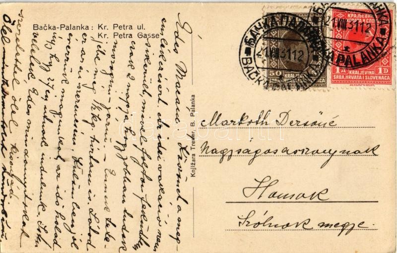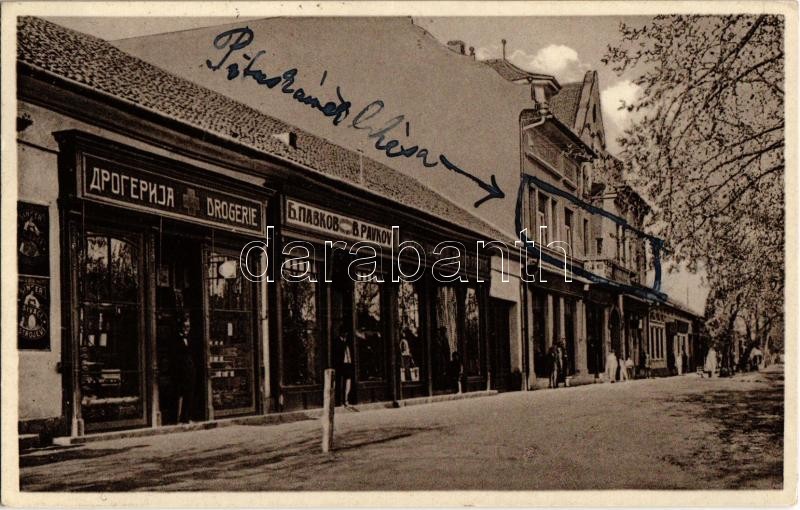 Beschreibung: Palánka, Bácska-Palánka, Backa Palanka; Péter király utca, gyógyszertár, B. Pavkov üzlete / Kr. Petra ul. / street view, pharmacy, shops