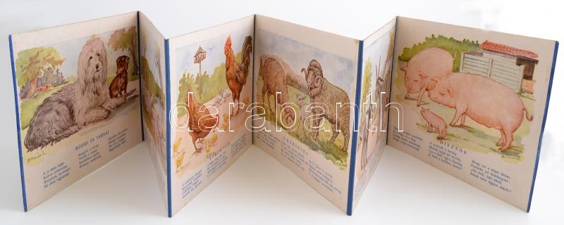 Székely László-Radnainé Bauer Erzsi: Bodri és társai. Szombathely,[1944], Martineum, hat színes tábla. Kiadói haránt-alakú leporelló kötés, javított kötéssel, kis kopásnyomokkal, az utolsó tábla háta kissé hullámos. Ritka!