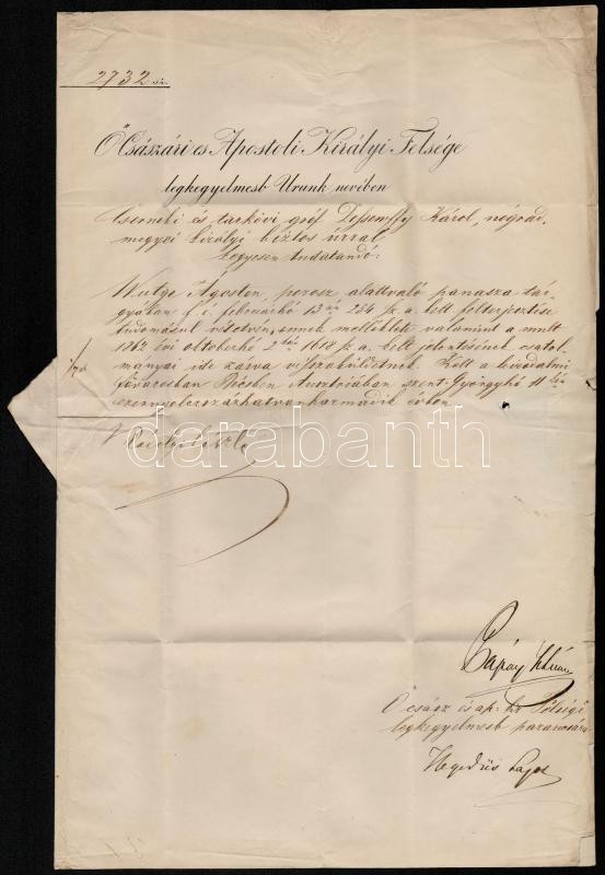 1863 A bécsi udvari kancellária leirata Dessewffy Károly (1811-1869) n... https://www.darabanth.com/de/310-Fernauktion/310.0/Andere-Sammelgebiete/Dokument~17/1863-A-becsi-udvari-kancellaria-leirata-Dessewffy-Karoly-1811-1869-nogradi-kiralyi-biztos-rC3~II1692544
