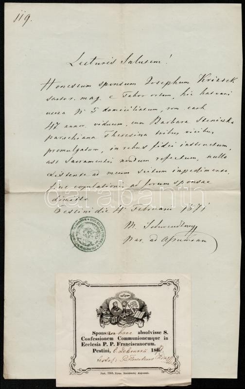1871 A pesti ferences plébánia tanúságlevele házasság ügyében, latin n... https://www.darabanth.com/de/310-Fernauktion/310.0/Andere-Sammelgebiete/Dokument~17/1871-A-pesti-ferences-plebania-tanusaglevele-hazassag-ugyeben-latin-nyelven-belyegzovel~II1692559