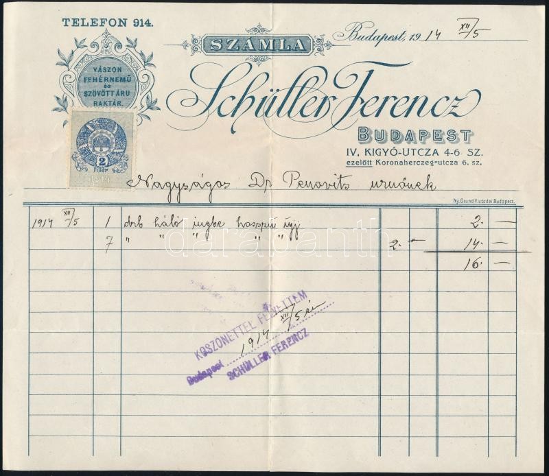 1914-1942 Schüller Ferenc díszes fejléces számla + Hobé díszes fejléce... https://www.darabanth.com/de/310-Fernauktion/310.0/Andere-Sammelgebiete/Dokument~17/1914-1942-Schuller-Ferenc-diszes-fejleces-szamla-plus-Hobe-diszes-fejleces-szallitolevel~II1692293