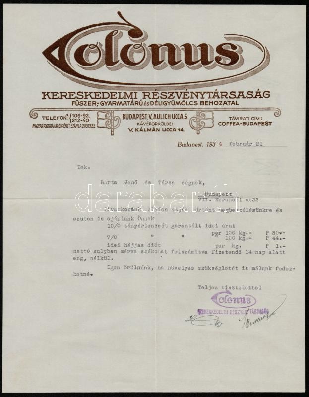 1934 Colonus Kereskedelmi Rt. díszes fejléces levél, 29x23 cm https://www.darabanth.com/de/310-Fernauktion/310.0/Andere-Sammelgebiete/Dokument~17/1934-Colonus-Kereskedelmi-Rt-diszes-fejleces-level-29x23-cm~II1692230
