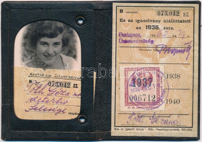 1936-1937 Magyar Királyi Államvasutak (MÁV) félárú jegy váltására jogo... https://www.darabanth.com/de/310-Fernauktion/310.0/Andere-Sammelgebiete/Dokument~17/1936-1937-Magyar-Kiralyi-Allamvasutak-MAV-felaru-jegy-valtasara-jogosito-fenykepes-ig~II1690396