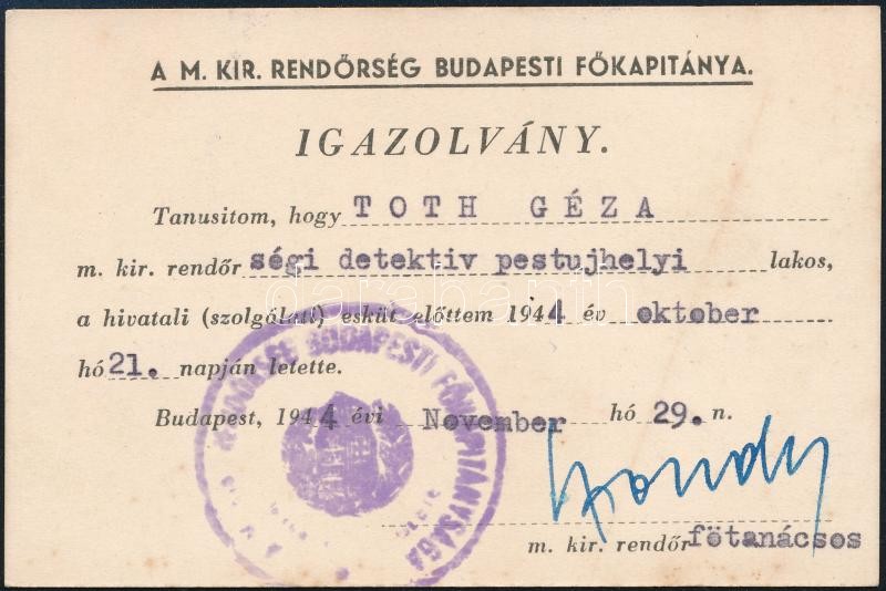 Beschreibung: 1944 Detektív igazolvány