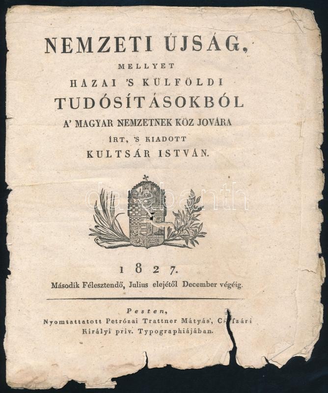 1827 Nemzeti Újság mellyet hazai 's külföldi tudósításokból a magyar nemzetnek a köz jovára. Írt, 's kiadott Kultsár István. Pest, Trattner Mátyás. 1827. július 4. második félesztendő, szakadozott, molyrágta, viseltes állapotban, a széleken hiánnyal, 8 p.