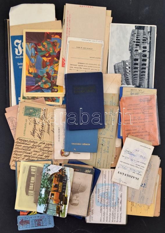 Vegyes papírrégiség tétel, közte judaika, és légiposta. különféle igazolványok, fotók, kártyanaptárak, tábori postai levelezőlapok, levelezőlapok, fotók, képeslapok, ..stb., változó állapotban.