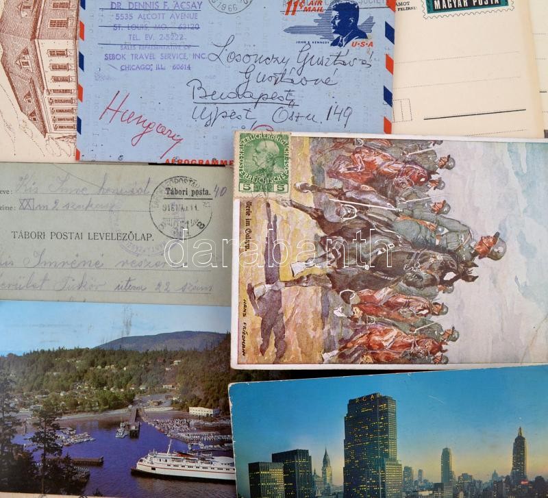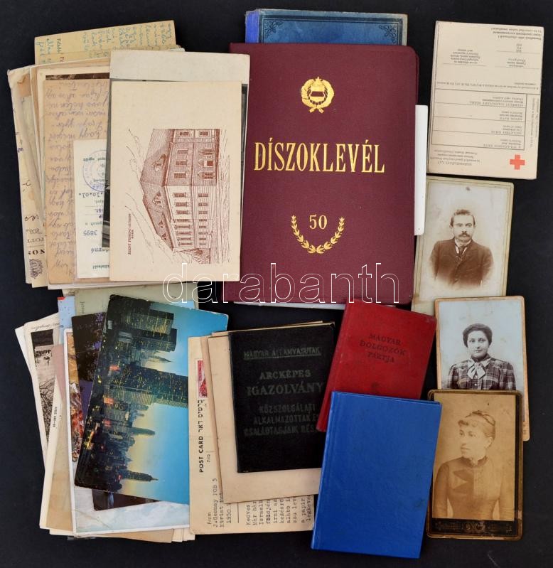 Vegyes papÃrrégiség tétel, közte különféle igazolványok, judaika, és légiposta,.fotók, levelezÅ‘lapok, képeslapok, dÃszoklevél, tanulmányi értesÃtÅ‘, tábori posta, különféle okmánybélyeges papÃrok, stb., változó állapotban.