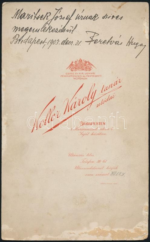 1903 Beretvás Hugó (1872-1940) zeneszerző, Ady első megzenésítőinek egyike, keményhátú fotó Koller Károly utódai budapesti műterméből, hátulján Beretvás dedikációjával, 21,5×13,5 cm