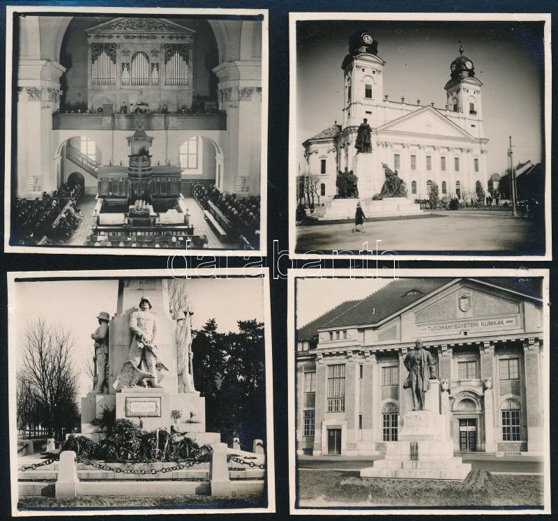 Beschreibung: cca 1930-1940 Debrecen (templom, szobor, egyetem), 4 db fotó, 6x6 cm