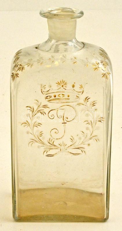 Beschreibung: Üveg palack, gravírozott, aranyozott díszítéssel, kopásnyomokkal, alján csorbával, 20x9x6 cm