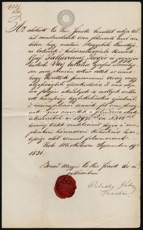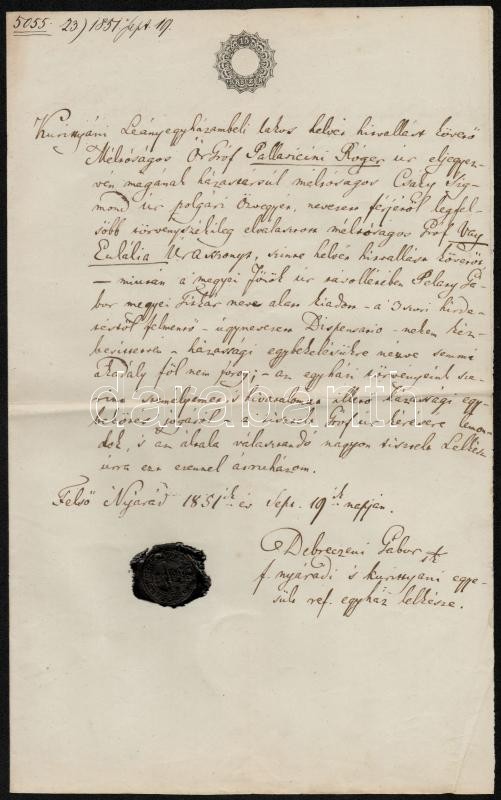 1851 gróf Pallavicini Roger (1814-1874) és Csáky Zsigmond özvegye, gróf Vay Eulália (1812-1873) közötti házasság ügyében a két fél plébánosainak nyilatkozata a házassági akadályok hiányáról.
