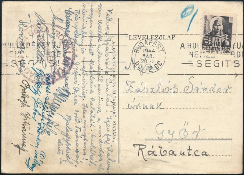 Beschreibung: 1944 A Gyóni Géza Irodalmi Társaság tagjai által küldött és aláírt képeslap elesett katona családjának.