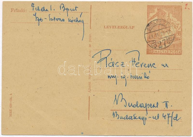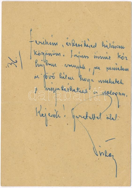 cca 1960 Fekete István (1910-1970) által megírt levelezőlap Rácz Ferencnek, göllei kántor tanítónak, Rácz Vali (1911-1997) színész- és énekesnő apjának, aki Fekete István apja után lett a község tanítója és ott tanított 1910-től 1948-ig, aláírással.