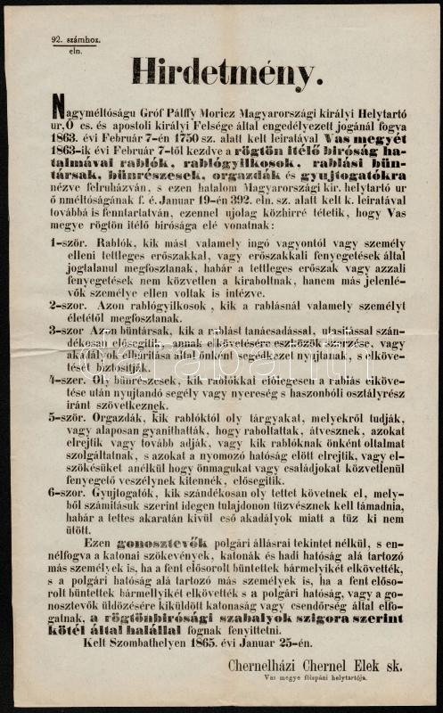 1865 Vas megyei rögtönítélő bíróság felállításáról szóló rendelet kétn... https://www.darabanth.com/de/310-Fernauktion/310.0/Andere-Sammelgebiete/Poster~29/1865-Vas-megyei-rogtonitelo-birosag-felallitasarol-szolo-rendelet-ketnyelvu-hirdetm~II1687507