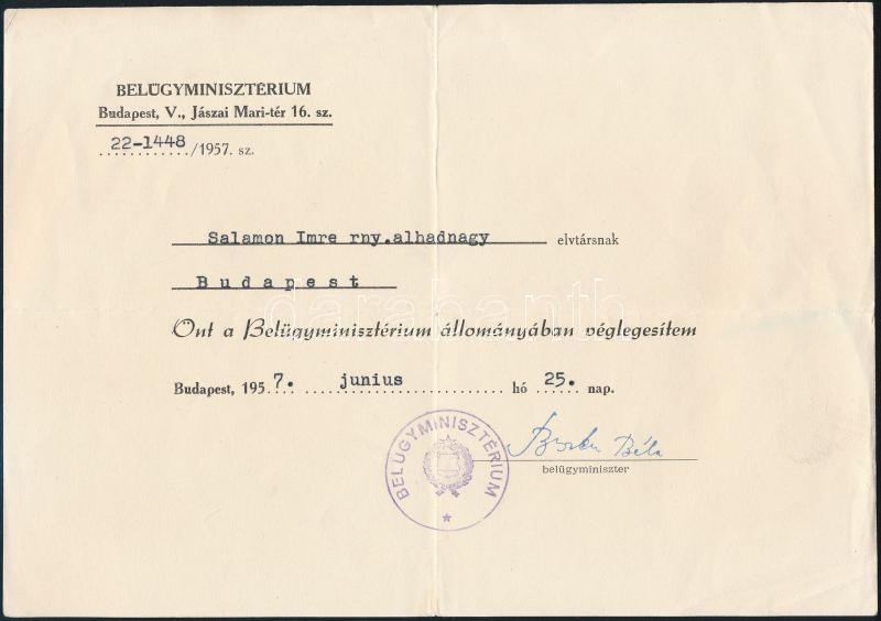 Beschreibung: 1957 Kinevezés Biszku Béla (1921-2016) belügyminiszter saját kezű aláírásával