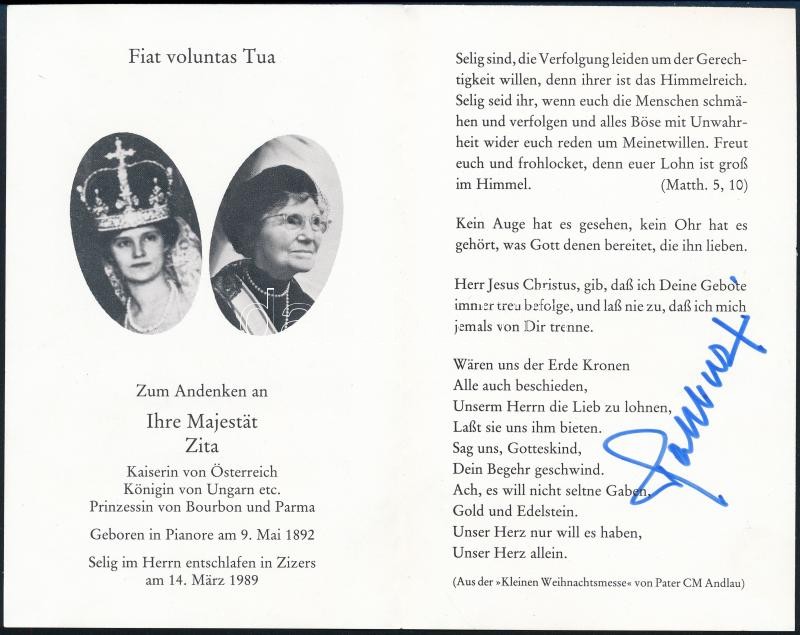 Habsburg Ottó aláírása Zita királyné halotti emléklapján https://www.darabanth.com/de/310-Fernauktion/310.0/Andere-Sammelgebiete/Signatur~19/Habsburg-Otto-alairasa-Zita-kiralyne-halotti-emleklapjan~II1689074