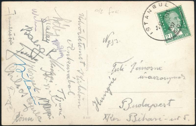 cca 1940 Törökország a Phöbus (I. osztályban 4. helyezett) labdarúgó csapat tagjai által aláírt képeslap. Csikos Gyula, Turay II. Balogh, Wéber, Fekete, Rökk.