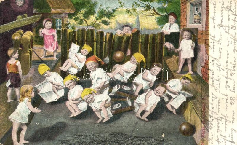 Beschreibung: Children on chamber pots. Bizarre art postcard