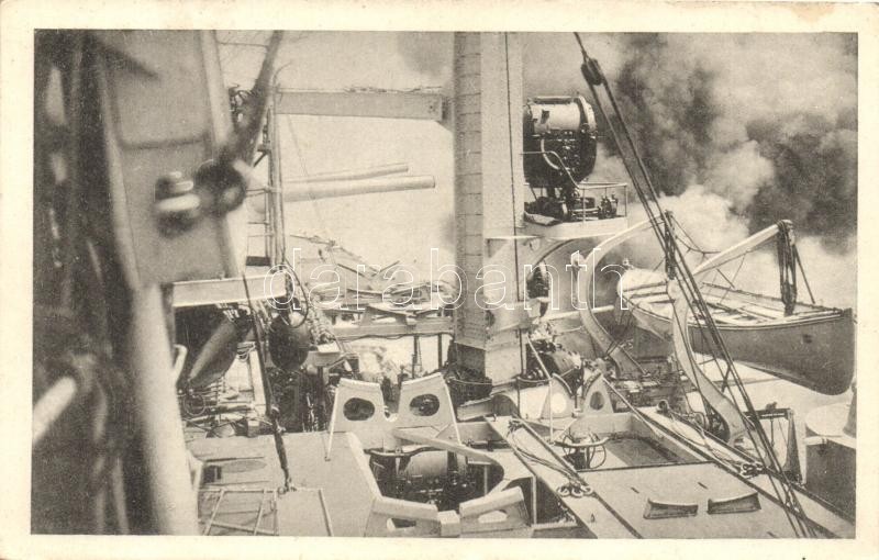 Abfeuern eines 30.5 cm Turmgeschützes / Osztrák-magyar hadihajó 30.5 cm-es torony-lövege tüzelés közben, oldalcsónak / Austro-Hungarian K.u.K. battleship's firing with 30.5 cm tower gun. Phot. A. Beer, Verlag F. W. Schrinner Pola + K.u.K. Kriegsmarine SMS Árpád (EK)
