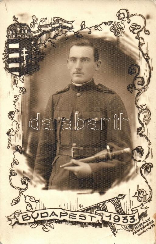 1933 Budapest, Katona tőrrel. címeres díszes fotólap Király fányképész... https://www.darabanth.com/de/310-Fernauktion/310.0/Ansichtskarten/Militaria~300073/1933-Budapest-Katona-torrel-cimeres-diszes-fotolap-Kiraly-fanykepesz-Hungarian-soldier-w~II1688300