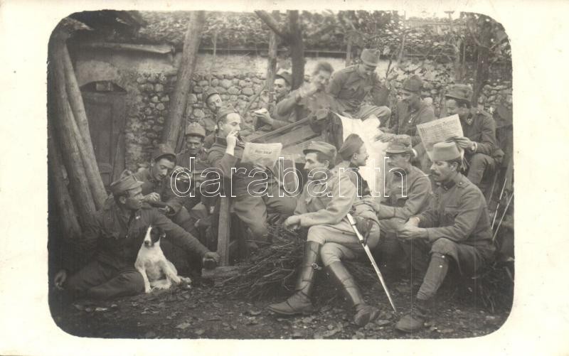 Osztrák-magyar katonák sziesztája a frontvonal mögött, Pesti Hírlapot olvasó katona, kutya / WWI Austro-Hungarian K.u.K. soldiers resting behind the front line. photo (EB)