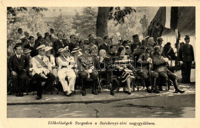 1939 Szeged, az 1919-es ellenforradalom 20 éves évfordulója. Előkelőségek a Széchenyi-téri nagygyűlésen; Takenchi, Erdmannsdorff, Gróf Vinci, Vitéz Bartha Károly, Vitéz Keresztes-Fischer Ferenc, Albrecht és József hercegek