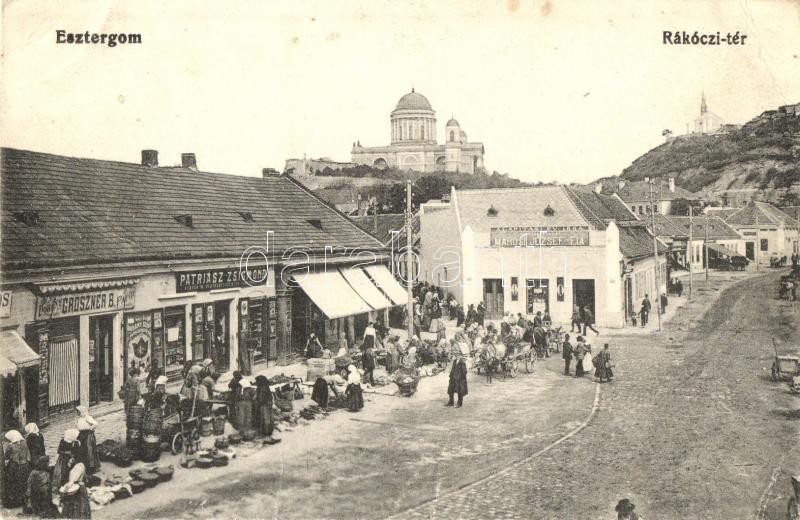 Beschreibung: Esztergom, Rákóczi tér, piac árusokkal, Groszner B., Patriász Zsigmond és Marosi József és fia üzlete. Groszner B. kiadása (EK)