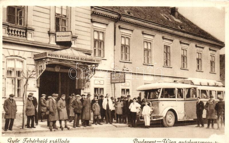 Győr, Fehérhajó szálloda, Budapest-Wien autóbusz megállóhelye (EK) https://www.darabanth.com/de/310-Fernauktion/310.0/Ansichtskarten/Ungarn~300005/Gyor-Feherhajo-szalloda-Budapest-Wien-autobusz-megallohelye-EK~II1692768