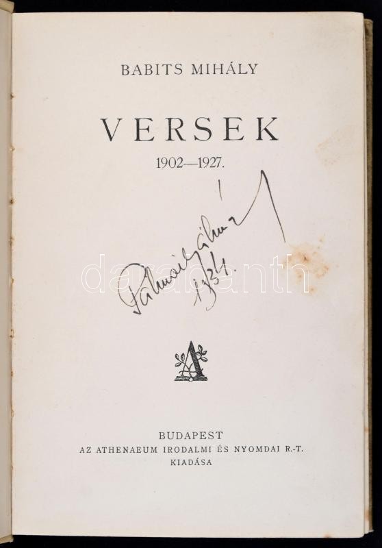 Babits Mihály: Versek 1902-1927. Bp.,(1928), Athenaeum. Első kiadás. K... https://www.darabanth.com/de/310-Fernauktion/310.0/Bucher/Bucher-Andere-kuriositaten~500018/Babits-Mihaly-Versek-1902-1927-Bp-1928-Athenaeum-Elso-kiadas-Kiadoi-egeszvaszon-kote~II1690561