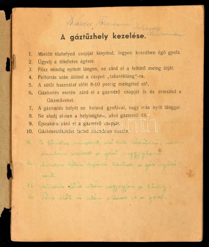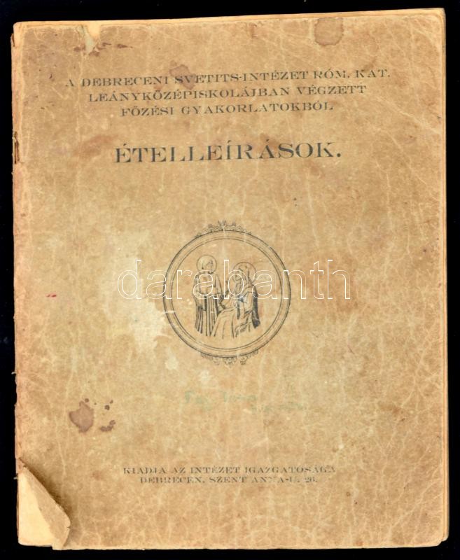 Debrecen, é.n. [1930 körül], Kiadja az Intézet Igazgatósága. (ny. n.). 100p. Mintegy ötven étel elkészítéséhez előnyomtatott füzet a tanulók számára. Tűzve, sérült papírborítékban.