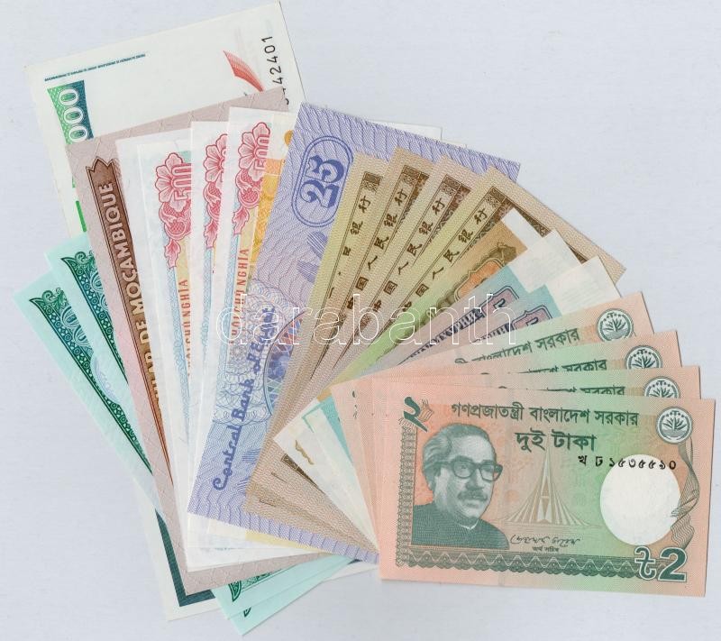 21db-os vegyes külföldi bankjegy tétel, közte Bangladesh, Egyiptom, Jugoszlávia, Kína, Mongólia, Mozambik, Vietnam, közte sorszámkövetők is T:I,I- 21pcs of various banknotes, including Bangladesh, Egypt, Yugoslavia, China, Mongolia, Mozambique, Vietnam, with a few sequential serials C:UNC,AU