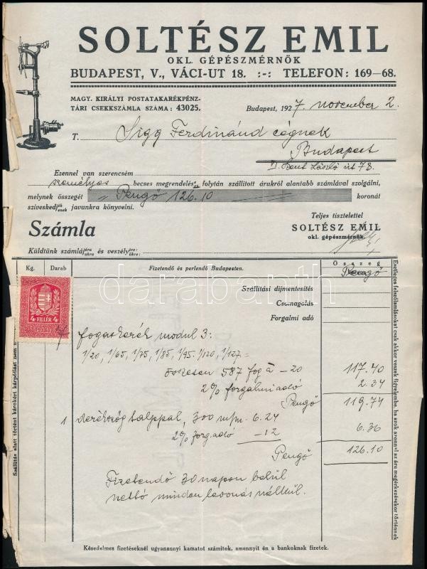 1927 Soltész Emil Gépészmérnök, díszes fejléces számla, okmánybélyegge... https://www.darabanth.com/de/311-Fernauktion/311.0/Andere-Sammelgebiete/Dokument~300016/1927-Soltesz-Emil-Gepeszmernok-diszes-fejleces-szamla-okmanybelyeggel-29x21-5-cm~II1701481