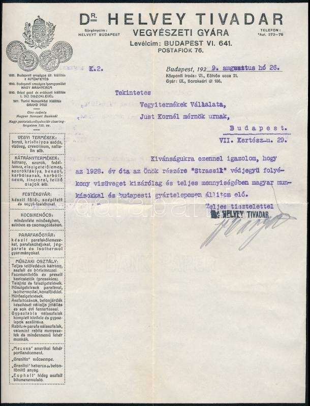 Beschreibung: 1929 Dr. Helvey Tivadar vegyészeti gyára, díszes fejléces levél, 20,5x21 cm
