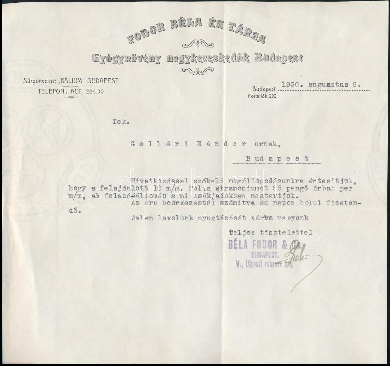 1930 Fodor Béla és Társa Gyógynövény nagykerekedők, díszes fejléces le... https://www.darabanth.com/de/311-Fernauktion/311.0/Andere-Sammelgebiete/Dokument~300016/1930-Fodor-Bela-es-Tarsa-Gyogynoveny-nagykerekedok-diszes-fejleces-level-21x22-cm~II1701544