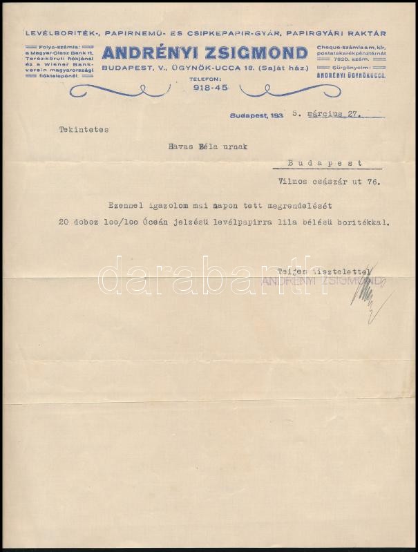 1935 Andrényi Zsigmond Levélboríték-, Papírnemü-, és Csipkepapír-Gyár,... https://www.darabanth.com/de/311-Fernauktion/311.0/Andere-Sammelgebiete/Dokument~300016/1935-Andrenyi-Zsigmond-Levelboritek--Papirnemu--es-Csipkepapir-Gyar-diszes-fejleces-sz~II1701553