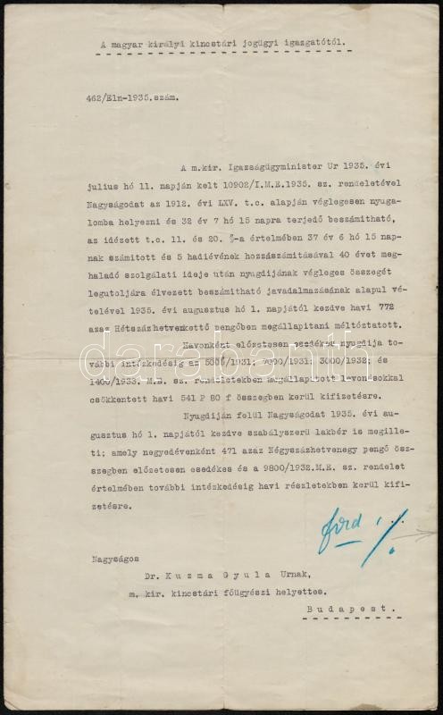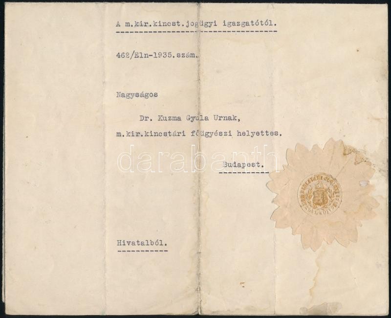 1935 Bp., A magyar királyi kincstári jogügyi igazgató által küldött le... https://www.darabanth.com/de/311-Fernauktion/311.0/Andere-Sammelgebiete/Dokument~300016/1935-Bp-A-magyar-kiralyi-kincstari-jogugyi-igazgato-altal-kuldott-level-nyugdijba-helyezC3~II1701417
