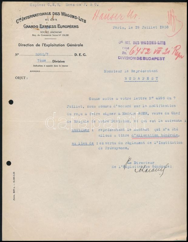 1938 Cie Internationale des Wagons-Lits et des Grand Express Européens... https://www.darabanth.com/de/311-Fernauktion/311.0/Andere-Sammelgebiete/Dokument~300016/1938-Cie-Internationale-des-Wagons-Lits-et-des-Grand-Express-Europeens-kitoltott-levelpapirjai-~II1701504