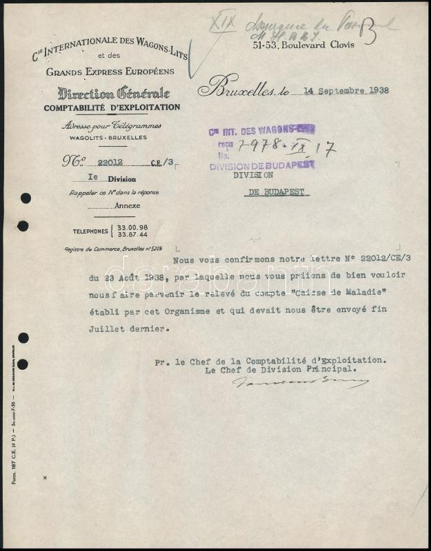 Beschreibung: 1938 Cie Internationale des Wagons-Lits et des Grand Express Européens kitöltött levélpapírjai, 4 db