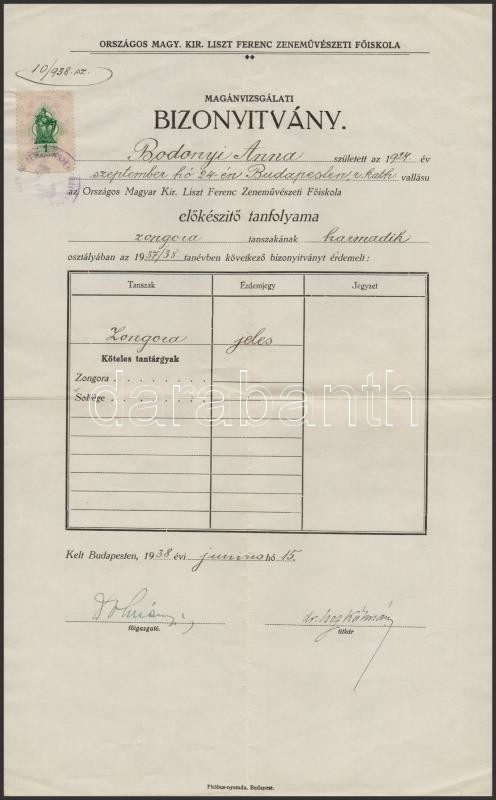 1938 Országos Magy. Kir. Liszt Ferenc Zeneművészeti Főiskola (Zeneakadémia) magánvizsgálati bizonyítványa, Dohnányi Ernőnek (1877-1960) az iskola főigazgatójának (1934-1943) és Isoz Kálmánnak (1878-1956), az iskola titkárának (1934-1943) aláírásaival, 1 p. okmánybélyeggel.