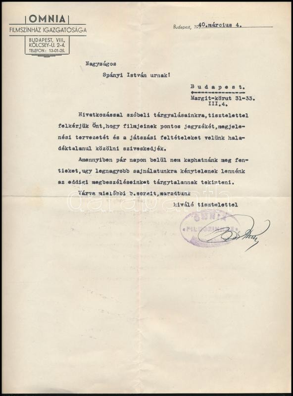1940 Omnia Filmszínház Igazgatósága, fejléces levél, 29x23 cm https://www.darabanth.com/de/311-Fernauktion/311.0/Andere-Sammelgebiete/Dokument~300016/1940-Omnia-Filmszinhaz-Igazgatosaga-fejleces-level-29x23-cm~II1701540