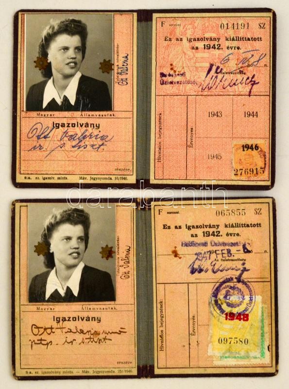 Beschreibung: 1942-1948 Magyar Államvasutak (MÁV) félárú jegy váltására jogosító fényképes igazolvány, 2 db