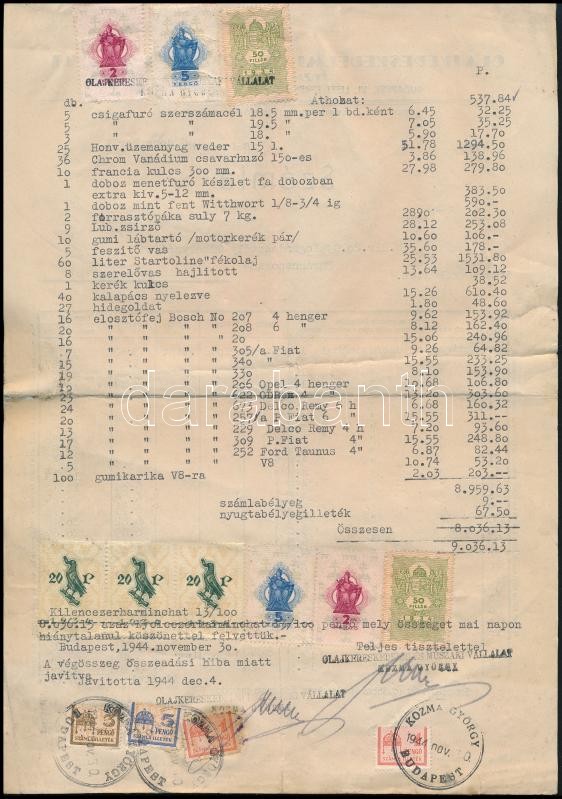 1944 Kozma György olajkereskedelmi műszaki vállalat által a 20. Gyaloghadosztály Műhelyszázad Parancsnokság részére kiállított számla okmánybélyegekkel és számlailleték bélyegekkel, bizottsági átvételi igazolással "M. kir. Z-999 tábori posta számú gazdasági hivatal"