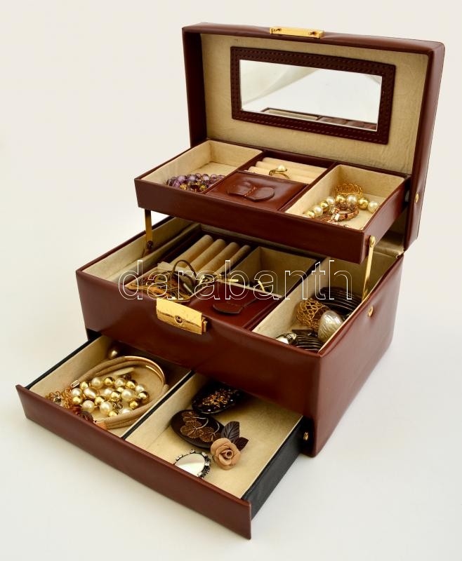 Háromfiókos ékszerdoboz, tükörrel, műbőr borítással, benne 20 db bizsu... https://www.darabanth.com/de/311-Fernauktion/311.0/Andere-Sammelgebiete/Flohmarkt~300011/Haromfiokos-ekszerdoboz-tukorrel-mubor-boritassal-benne-20-db-bizsuval-jo-allapotban~II1696006