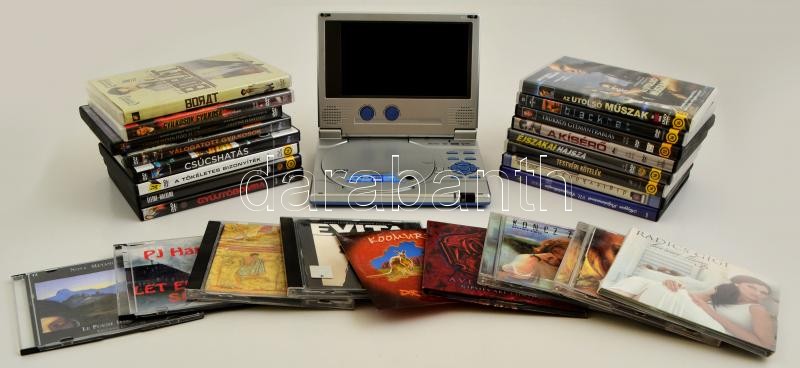 Beschreibung: Mustek hordozható DVD lejátszó, tartozékokkal, leírással, 27 db DVD filmmel és zenei CD-vel köztük bontatlanok is