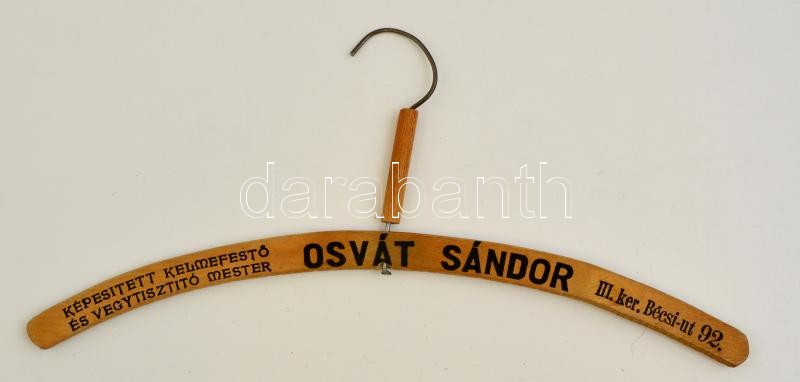Beschreibung: Osvát Sándor Képesített Kelmefestő és Vegyes Mester III. ker. Bécsi út 92. fa vállfa, h: 42 cm