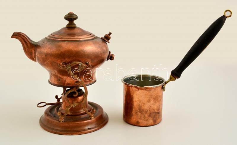 Régi réz teafőző, fa fogóval, borszeszégővel, állványon, kopott, kis hiánnyal+Pistaccino fém kávékiöntő, gyöngyház berakásos fa markolattal, a markolat kopott, m: 18 cm, d: 11 cm,+ m: 19 cm, d: 7 cm.