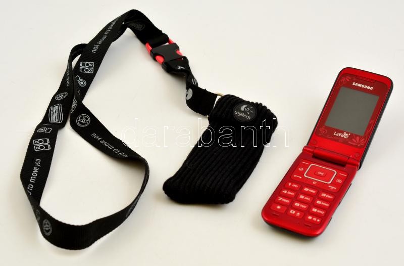 Beschreibung: Samsung kihajthatós mobiltelefon Logitec nyakba akasztós tokkal, akkucserére szorul,