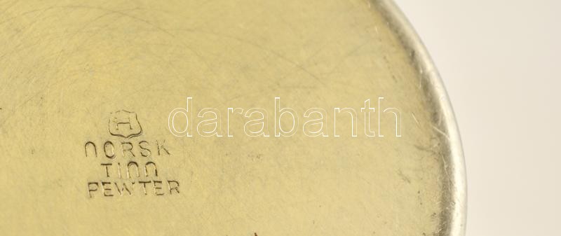 Beschreibung: "Stavanger" norvég fém fedeles kupa, ón díszítésekkel, jelzett, fedél belső peremén deformációval, m: 18 cm, d: 8 cm